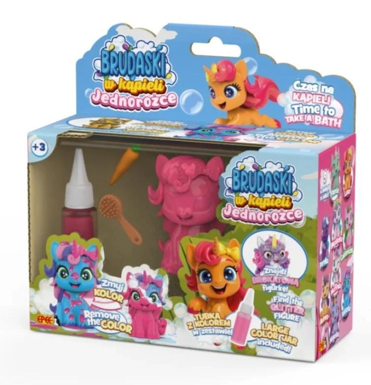 Zawartość opakowania: 1 figurka jednorożca, 1 tubka z różowym błotkiem, 1 akcesorium