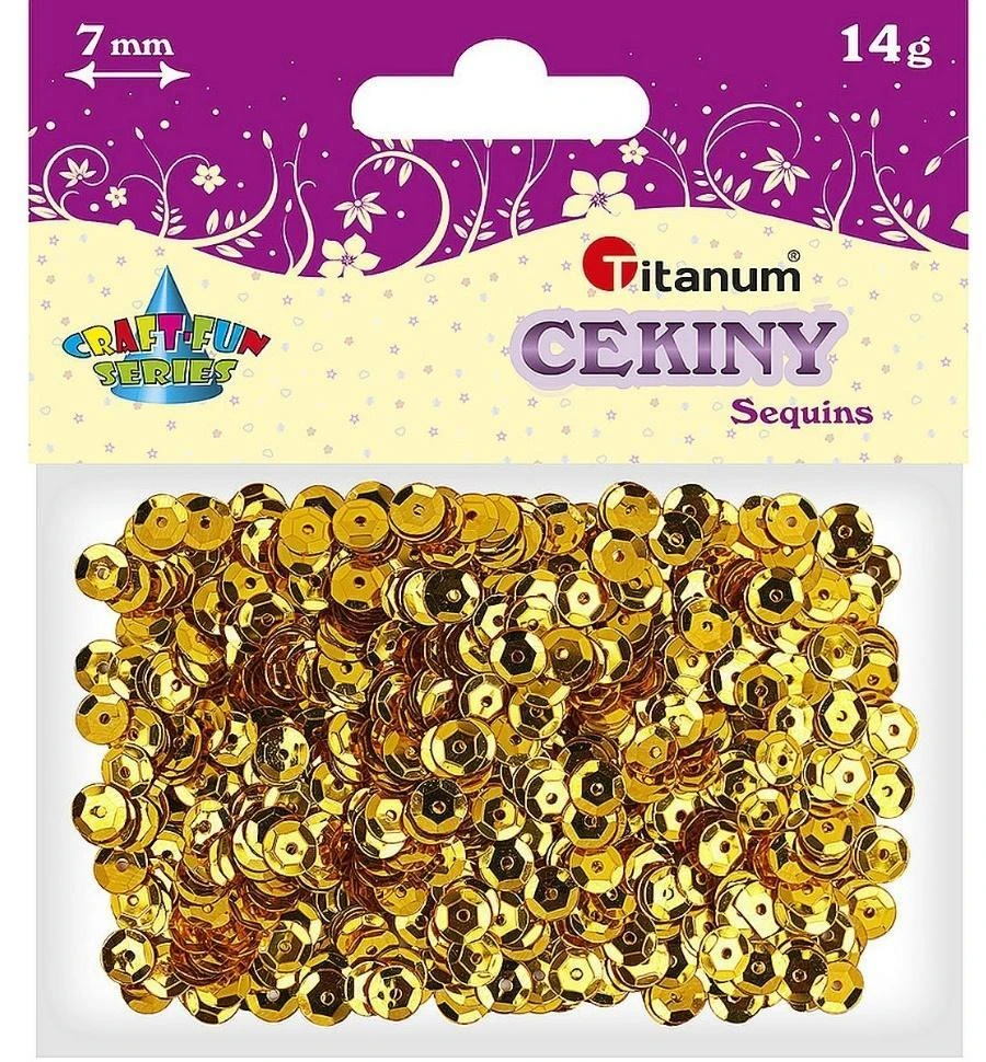 Cekiny okrągłe. Kolor: metaliczny złoty, średnica: 7 mm. Opakowanie: 14 g.