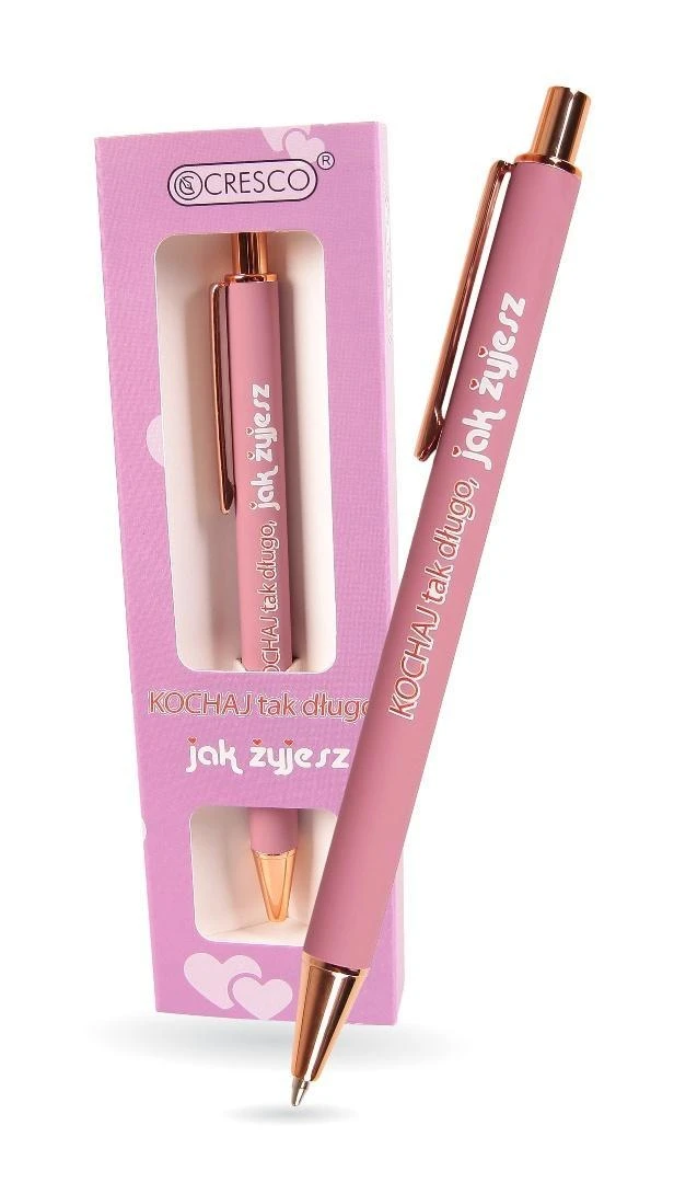 Długopis automatyczny z wymiennym wkładem 1mm. Kobieca kolorystyka, softowy, pastelowy korpus ze wykończeniami w odcieniach różowego złota. Nadruk na długopisie i pudełeczku to Kochaj tak długo, jak żyjesz. Dodatkowo wzbogacony nadruk o wyjątkową grafikę. Długopis zapakowany w prezentowe etui GB, w sam raz na upominek dla NIEJ.