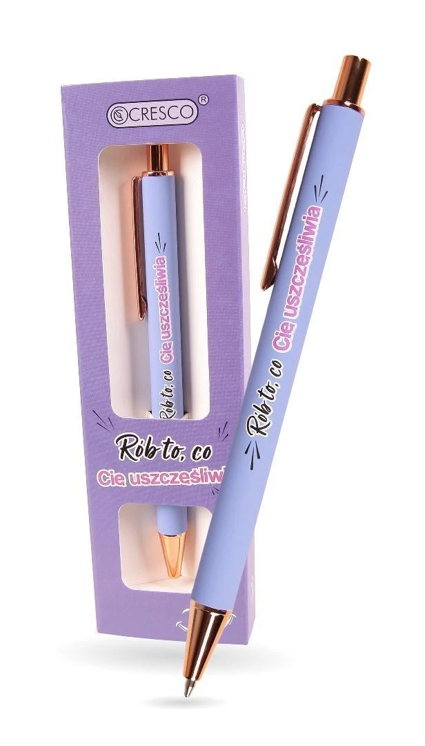 Długopis automatyczny z wymiennym wkładem 1mm. Kobieca kolorystyka, softowy, pastelowy korpus ze wykończeniami w odcieniach różowego złota. Nadruk na długopisie i pudełeczku to Rób to, co Cię uszczęśliwia. Dodatkowo wzbogacony nadruk o wyjątkową grafikę. Długopis zapakowany w prezentowe etui GB, w sam raz na upominek dla NIEJ.