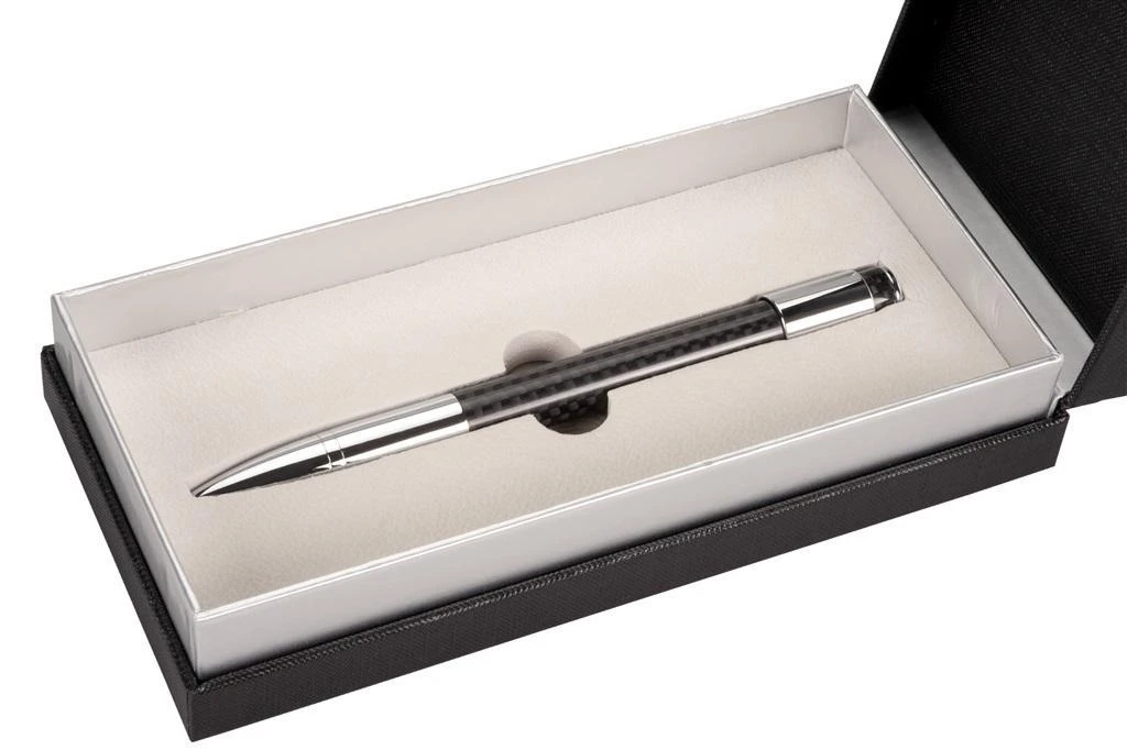 Długopis biznesowy w pudełku kaszerowanym Materiał : Carbon inaczej włókno węglowe to materiał wyjątkowy pod każdym względem: niezwykle wytrzymały, lekki, o unikalnym prestiżowym wyglądzie. dodatkowo długopis posiada kręcący się element fidget.