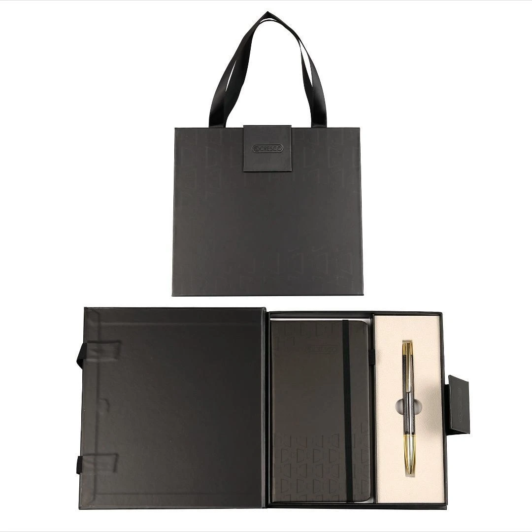Zestaw prezentowy w ciekawym opakowaniu imitującym torebkę prezentową. Komplet zawiera notes z gumką i wstążką oraz elegancki grafitowy długopis ELEGANT ze złotymi wykończeniami. Zestaw upominkowy spakowany w kartonowe etui z zapięciem magnetycznym. Po zamknięciu opakowanie przybiera postać torebki prezentowej z uchwytami ze wstążki. Zatem po zakupie jest to gotowy prezent do wręczenia na różne okazje.