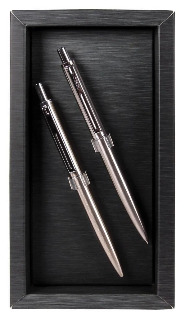Elegancki zestaw długopis + ołówek automatyczny marki Cresco z ekskluzywnej linii Reporter ze stali nierdzewnej. Zapakowany w prezentowe etui.