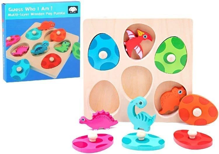 Drewniana układanka Dinozaury w jajkach to kolorowa gra edukacyjna, która rozwija spostrzegawczość, pamięć i zdolności manualne dziecka. Na planszy umieszczono sześć uroczych dinozaurów ukrytych pod pokrywkami w kształcie jajek. Zadaniem dziecka jest dopasowanie każdego dinozaura do jego jajka według koloru lub gra w memory, polegająca na zapamiętywaniu położenia poszczególnych par.