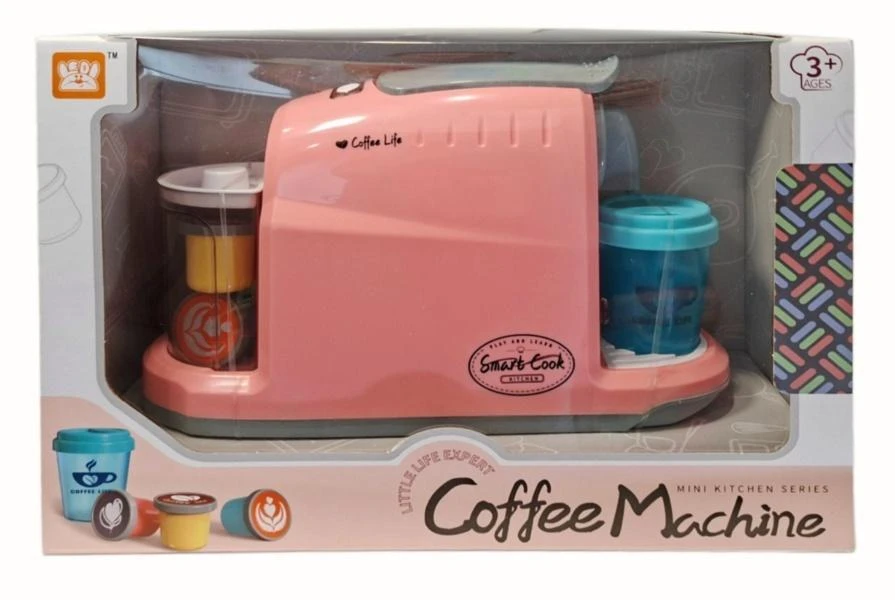 Zabawka ekspres do kawy z kubeczkami i kapsułkami. Elementy imitują prawdziwe urządzenie kuchenne. Zapakowana w kartonowe pudełko. Zabawka przeznaczona dla dzieci od lat 3. Zabawka działa na baterie typu AA. Baterie nie są załączone do zabawki.