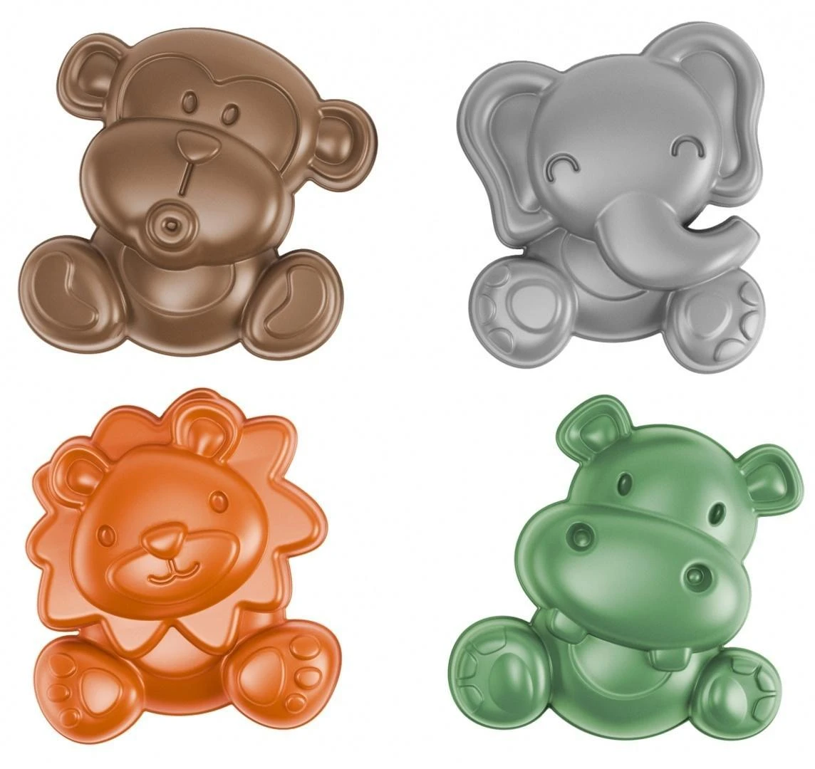 Zestaw zawiera 4 foremki w kształcie zwierzątek safari: hipopotam, słoń, lew, małpa.