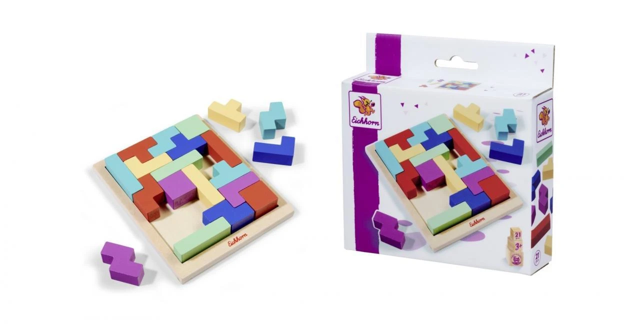 Drewniana ramka (13,5 x 17 cm) z 20 klockami, różne kształty i kolory, 21 elementów, brzoza, 3l+