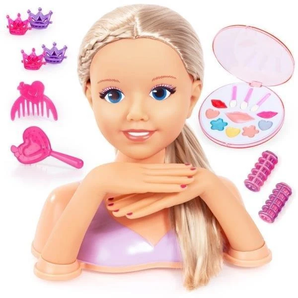 Dzięki głowie do stylizacji (25 cm) możesz przekształcić każdy pomysł na stylizacje w rzeczywistość. Możesz wypróbować wiele różnych fryzur. Dołączamy pędzel, grzebień, spinki do włosów i lokówki. Bardzo się przydadzą, aby idealnie ułożyć włosy. Aby uzyskać efektowny wygląd, nie można przegapić wspaniałego makijażu! Z jej urocza twarzą, fryzjerska głowa jest prawdziwa pięknością. Ręce można obrócić w stronę dziecka. Można również poruszać sama głowa. Idealna do kreatywnej zabawy i ćwiczenia zręczności.