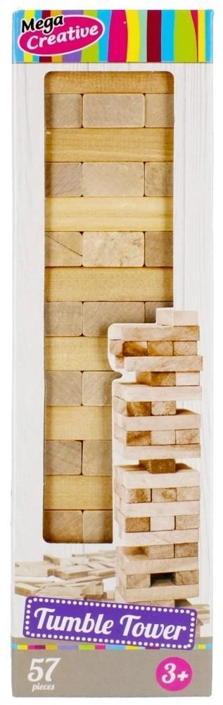 Zalety produktu: rozwija kreatywność dziecka oraz zdolności manualne, pobudza wyobraźnię. Oto prawdziwa gratka dla fanów popularnej gry. Ekscytująca, trzymająca w napięciu rozrywka. Dzięki MEGA CREATIVE zbudujesz wieżę za pomocą drewnianych klocków. Przygotuj się na śmiech i wiele niespodzianek, wyciągaj na zmianę bloki i układaj na górze tak aby wieża nie zwaliła się! Gra zawiera 57 drewnianych bloków. Zawartość zestawu: 57 drewnianych klocków. Gra wykonana z drewna. Wymiary/waga/baterie: wymiary produktu (dł. x wys. x gł.) [cm]: 8x28x8, wymiary opakowania (dł. x wys. x gł.) [cm]: 8x29x8, waga produktu bez opakowania [kg]: 0,96 kg, waga produktu w opakowaniu [kg]: 1,01 kg, nie wymaga zasilania bateriami. Przeznaczona dla dzieci w wieku: 3+. Gra pakowana w kartonik z okienkiem.