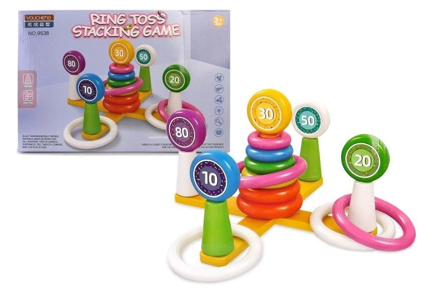 W zestawie: 4 obręcze do rzucania, elementy podstawy, paliki, obręcze do piętrzenia, tarcze z punktacją, funkcje: gra polega na rzucaniu obręczy tak, by trafić na najlepiej punktowany palik,wym. po rozłożeniu 40 x 40 x 25 cm, wym. opak. 38 x 27 x 8,2 cm, 3+