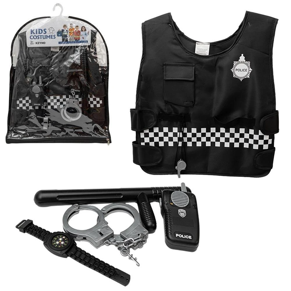 W środku znajduje się wszystko, czego potrzebuje mały obrońca porządku: kamizelka z kieszonką zapinana na rzepy, z gumeczkami do trzymania najważniejszych atrybutów przy sobie, pałka policyjna, kajdanki z kluczykami, krótkofalówka z dźwiękiem sygnału pojazdu policyjnego, gwizdek na sznureczku oraz zegarek.