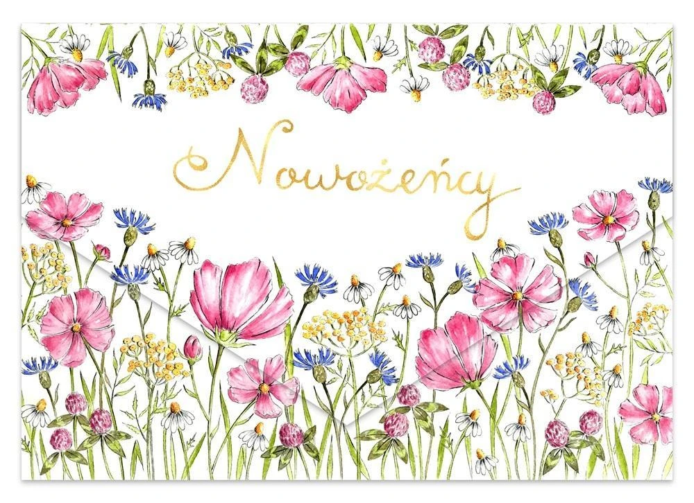 Karnet z kieszonką na pieniędze w formacie A5, składany z trzech. Złocony i tłoczony, teksy życzeń w środku. Wydrukowany na wysokiej jakości papierze. W zestawie koperta.