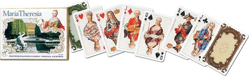 Najwyższej jakości karty do gry renomowanej firmy Ferd. Piatnik & Sohne. W komplecie 2 talie w eleganckim, złoconym pudełku z charakterystyczną poduszeczką. "Maria Teresa" to jeden z najbardziej rozpoznawalnych i lubianych w Polsce wzorów Piatnika. Na awersach europejskie historyczne postaci głównie z XVIII wieku. Rewersy nie tylko szlachetne, ale także symetryczne i wyraźnie różniące się od siebie. Talie składają się z 55 plastikowanych kart o wymiarach 58 x 89 mm i gramaturze 310. Idealne zarówno do brydża, pokera, remika jak i innych gier. Wyroby wiedeńskiej fabryki Ferd. Piatnik & Sohne od 1824 roku urzekają bogactwem wzorów i perfekcją wykonania. Jakość i tradycja!