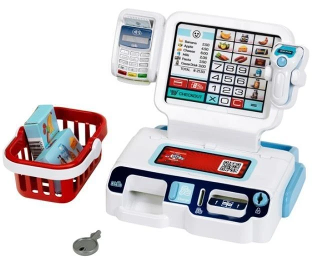 Klein 7265 Kasa samoobsługowa zamienia sklep Twojego dziecka w nowoczesny supermarket, sklep samoobsługowy lub restaurację! Wystarczy wyposażyć zabawkowe stanowisko kasowe w odpowiednie urządzenie, włączyć je i gotowe.Klienci biorą to, czego chcą z półek, wkładają zakupy do koszyka i idą do kasy. Tam towary są wprowadzane na klawiaturze lub skanowane z charakterystycznym sygnałem dźwiękowym. Jeśli wśród nich znajdują się paczki Kleina, skaner rozpoznaje ich kod, a praca z kasą jest jeszcze płynniejsza. Pieniądze na zapłacenie za wszystko są na wyposażeniu zabawki. Są tam zarówno monety i banknoty, które można włożyć do kasy i wyjąć, a gdy zabawa się skończy, po prostu zamknij kasę, wyłącz ją i czekaj na następne zakupy. Zasilana bateryjnie ekspresowa kasa do pokoju Twojego dziecka sprawi radość małym klientom chcącym bawić się w sklep. Zabawkę można włączać i wyłączać za pomocą przełącznika, a dzięki podświetlanemu wyświetlaczowi i trzem wymiennym ekranom może ona przekształcić się w sklep samoobsługowy, restaurację lub klasyczny supermarket. Oprócz skanera ze światłem i dźwiękiem oraz klawiatury z funkcją dźwięku, na wyposażeniu znajdują się jeszcze zabawkowe pieniądze, koszyk na zakupy i miniaturowe pudełka, które sprawiają, że każdy zakup staje się niezapomnianym przeżyciem. Ta nowoczesna kasa zachęca dzieci do wzięcia udziału w zabawie polegającej na odgrywaniu ról, która rozwija wyobraźnię i umiejętności komunikacyjne. Specyfikacja : Wymiary: 24,4 cm x 21,7 cm x 22,2 cm Odpowiednie dla dzieci w wieku od 3 lat Wymagane baterie: 2 x R03-AAA - brak w zestawie Skaner ze światłem i dźwiękiem Wyświetlacz z 3 motywami Koszyk zakupowy, pieniądze na zabawki i wiele więcej