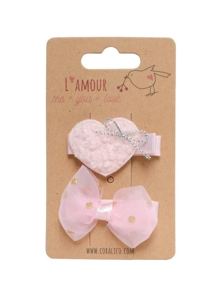 Zestaw klipsów z serduszkiem i kokardką w kolorze różu.