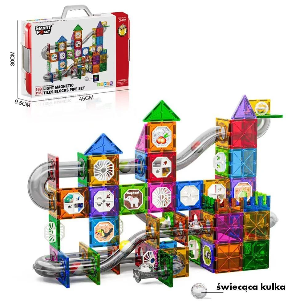 Duży zestaw świecących klocków magnetycznych. Zawiera 168 elementów. Świecąca kulka. Wymagane baterie: 1xGR1220 (dołączone). Wymiary opakowania: 45 x 9,5 x 30 cm