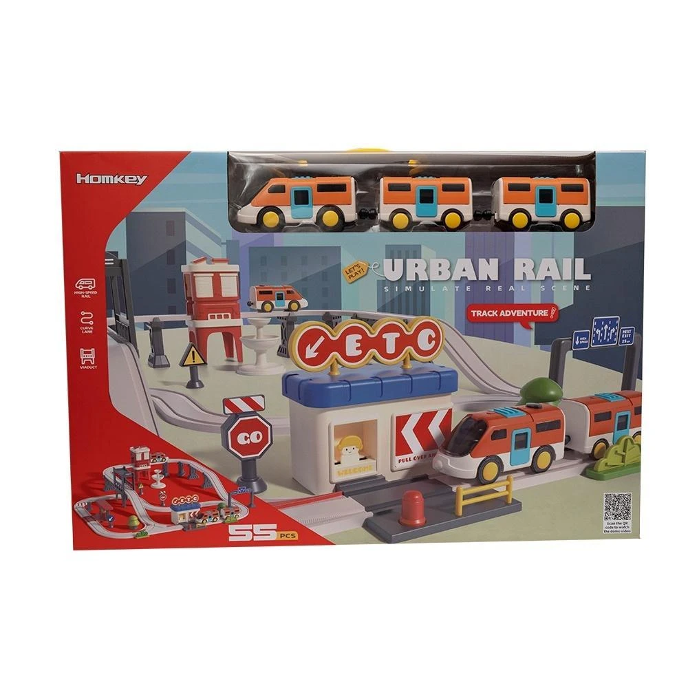 Kolejka miejska 55 elem. Wymiary torów po rozłożeniu: 84.3 x 78 x 18.3 cm Wymiary opakowania: 50.8 x 9.5 x 34.8 cm Wiek 3+