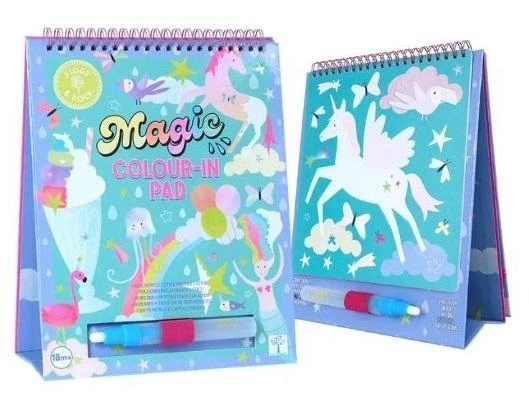 Kolorowanka wodna z pisakiem i podpórką to świetna zabawa dla najmłodszych. Wystarczy napełnić pisak wodą i zachęcić dziecko do kreatywnej zabawy, aby zobaczyć, jak kolory i kształty magicznie się pojawiają, a po wyschnięciu znikają. Dziecko będzie się świetnie bawić, odkrywając magiczne syrenki, jednorożce, kolorowe motyle i nie tylko. Sześć zabawnych kart jest połączonych w spiralnie oprawionej okładce, dzięki czemu można je odwracać po ukończeniu. Podpórka wygodnie podtrzymuje karty wielokrotnego użytku. Po zakończeniu zabawy wystarczy złożyć podpórkę, a dzięki elastycznej gumce pisak zawsze będzie na swoim miejscu.