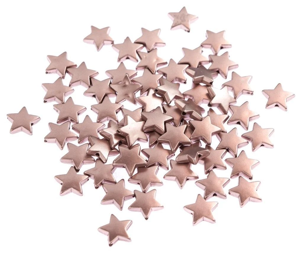 Koraliki gwiazdki w kolorze różowego złota to uroczy dodatek do własnoręcznie tworzonej biżuterii. Każda gwiazdka posiada dziurki w dwóch miejscach, dzięki czemu bez problemu można nawlec je na elastyczny sznurek lub cienki łańcuszek.