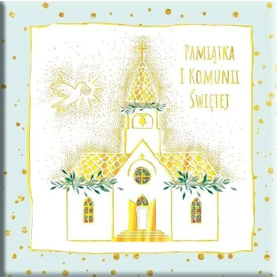Książeczka Komunijna w formacie 21,5 x 21,5 cm. Oprawa twarda złocona. Autorskie ilustracje, własny dobór tekstów. Książeczka 12-nasto stronicowa z kopertą na pieniążki.