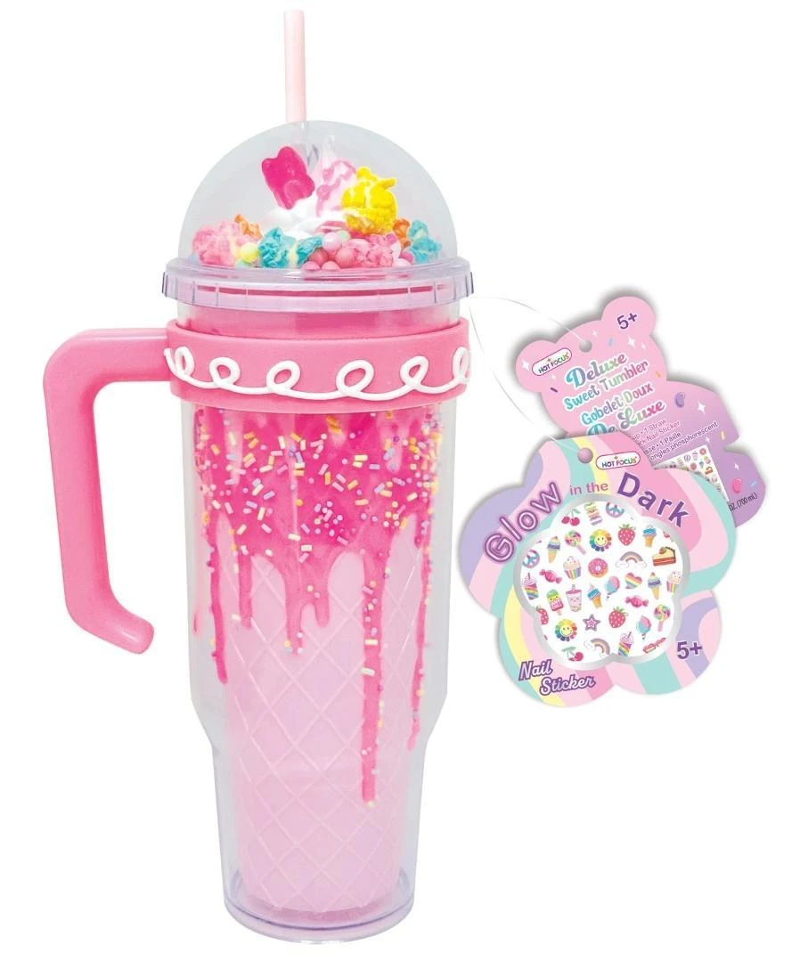 Ogromny kubek z uchem o pojemności aż 700ml, wykonany z grubego plastiku, z podwójną ścianką dla dodatkowej ochrony. Zakręcany nakrętką z przezroczystą kopułą pod którą znajdują się ozdobne elementy. Do kubka dołączona jest wielorazowa słomka oraz arkusz naklejek świecących w ciemności, którymi można dodatkowo ozdobić i wyróżnić swój kubek! Wymiary kubka: 31x14,6x11cm. Wiek: 5+.