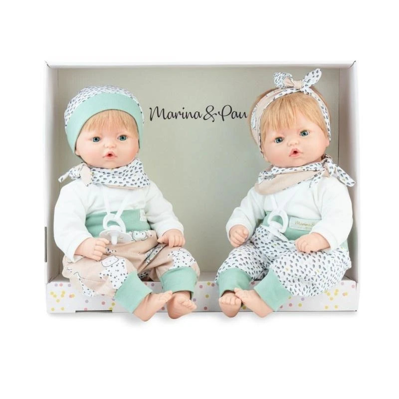 Modnie ubrana para 40-centymetrowych bliźniaków to jedyna w swoim rodzaju propozycja od producenta lalek hiszpańskich - Marina &Pau. Są to modele interaktywne - po wyjęciu smoczka magnetycznego bobasy płaczą. To wymarzona zabawka dla dzieci, które uwielbiają lalki przytulać, kołysać do snu i przebierać. Wykonane w całości w Hiszpanii lalki posiadają miękki brzuszek oraz głowę i kończyny wykonane z gładkiego, jasnego, ręcznie malowanego winylu. Ubrane są w dopracowane w każdym szczególe ręcznie szyte ubranka o delikatnej kolorystyce.