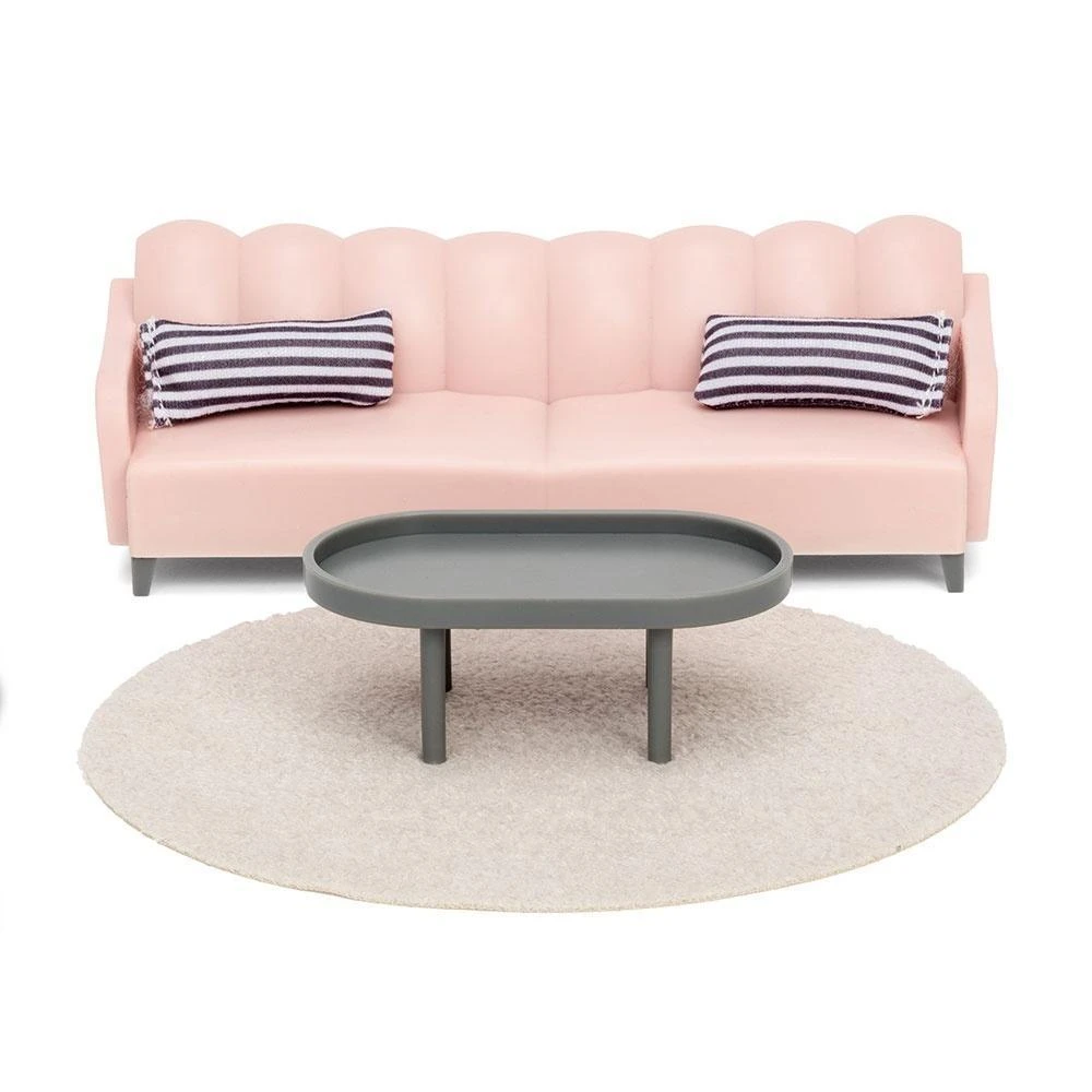 Ten podstawowy zestaw mebli do salonu do domku dla lalek marki Lundby z serii basic zawiera wygodną sofę, stolik kawowy, miękki okrągły dywan i dwie pasiaste poduszki zapewniające komfortowy wypoczynek.