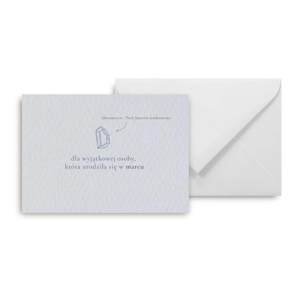 Kartka urodzinowa z akcentem akwamarynu kamienia marca, symbolu odwagi i szczerości. Idealna,