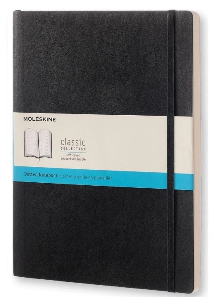 Notes o wymiarach 19 x 25 cm w klasycznym czarnym kolorze. Posiada dodatkową kieszonkę na luźne kartki, czy wizytówki. Zamykany na gumkę oraz wyposażony w przydatną materiałową zakładkę, w pasującym do okładki kolorze. Notes wypełniony jest bezkwasowym papierem. Miękka oprawa o charakterystycznych dla Moleskine zaokrąglonych rogach nie wystaje poza linię kartek. Zadziwia ona elastycznością i odpornością. Dodatkowo dzięki niej notes jest tak lekki, że nawet nie zauważysz, że zawsze masz go przy sobie.