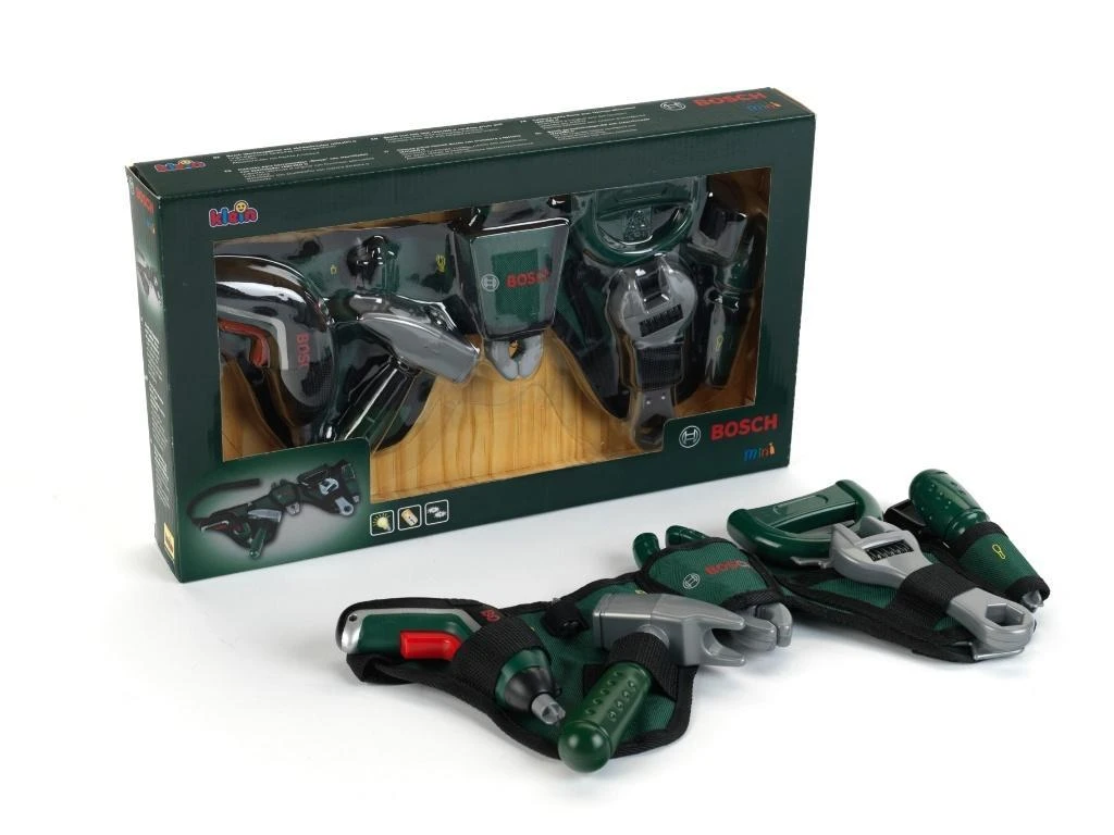 Pas z narzędziami Klein powstał na licencji Bosch, dlatego też są wierną kopią prawdziwego pasa produkowanego przez tę firmę. W zestawie w zapakowanym w zielony kartonik Klein, znajdziemy zielony pas obszyty czarną lamówką, wyposażony w kieszonki i uchwyty na narzędzia. Pas ma regulowaną długością dlatego będzie pasował dla większości dzieci w różnym wieku. W komplecie z pasem jest dodatkowo młotek i kombinerki z ciemno-zielonymi rączkami, piła, śrubokręt i klucz francuski oraz bezprzewodowa wkrętarka Ixiolino II. Wkrętarka jest solidnie wykonana z dużą dbałością o szczegóły, ma dwie wymienne końcówki śrubokręta, przez co wiernie naśladuje prawdziwe urządzenie. Zabawka jak prawdziwa ma wygodny uchwyt z gumową powierzchnią ułatwiającą utrzymanie zabawki w dziecięcych dłoniach, ma możliwość przełączenia za pomocą czerwonego przesuwaka obrotu końcówki w prawo i w lewo, a także diodę podświetlającą miejsce wkręcania, zamieszczoną nad bitem. Wszystkie narzędzia są wykonane z plastiku i bezpieczne dla dziecka. Pas z narzędziami Bosch to wspaniała zabawka dla każdego małego majsterkowicza, która zapewni długie godziny świetnej zabawy. Dzięki tej zabawce dzieci w bezpieczny sposób będą mogły wcielić się w rolę majsterkowicza, zapewniając sobie realistyczne doświadczenie korzystania z wkrętarki i pozostałych narzędzi znajdujących się w kieszeniach pasa. Dzieci uwielbiają naśladować rodziców wykonujących codzienne czynności domowe lub w nich uczestniczyć, jednak nie zawsze jest to możliwe ze względów bezpieczeństwa. Dzięki temu całkowicie bezpiecznemu dla dzieci, zabawkowemu pasowi z narzędziami każdy mały majsterkowicz może robić to, co jego opiekunowie. Zabawka wymaga użycia baterii, które nie są zawarte w zestawie.