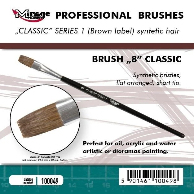Mirage Hobby Pędzle Płaskie PROFESSIONAL Seria płaskich pędzelków o wysokiej jakości syntetycznym włosiu i krótkim trzonku. Pędzle z serii PROFESSIONAL Seria 1 idealnie nadają się do malowania po różnych powierzchniach, jak i również świetnie poradzą sobie z użyciem w technice "suchego pędzla" (DRY BRUSH). Idealne do pracy ze wszelkiego rodzaju farbami akrylowymi, olejnymi, wodnymi etc
