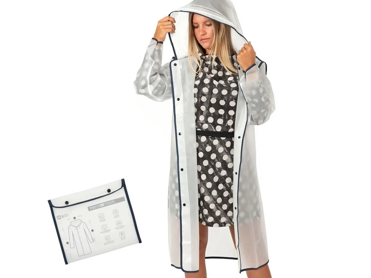 Peleryna przeciwdeszczowa transparentna (przeźroczysta) - praktyczna i nowoczesna ochrona przed deszczem, idealna na spacery, podróże czy codzienne dojazdy. Wykonana z wysokiej jakości materiału EVA, który jest lekki, miękki, oddychający i szybkoschnący, dzięki czemu zapewnia komfort noszenia nawet podczas dłuższego użytkowania. Peleryna posiada granatowe detale w postaci obszyć i zapięć, co dodaje jej stylowego wyglądu. Wyposażona w kaptur ze sznurkami do regulacji oraz plastikowe zatrzaski na przodzie i rękawach, które umożliwiają dopasowanie do sylwetki i zapobiegają podwijaniu się rękawów. Odblaskowe elementy zwiększają widoczność po zmroku i w trudnych warunkach pogodowych. Dzięki kompaktowym wymiarom po złożeniu oraz dołączonemu etui, peleryna zmieści się w torebce lub plecaku - idealna do zabrania wszędzie ze sobą. Wymiary: - Szerokość w klatce piersiowej: 68 cm - Długość całkowita: 114 cm Rekomendowany wzrost użytkownika: 180-195 cm