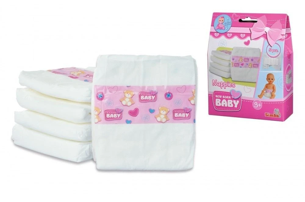 Zestaw 5 pieluszek dla lalek o wysokości 38-43 cm. Zestaw zapakowany w