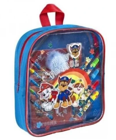 Zestaw do kolorowania Psi Patrol w plecaku z przezroczystym przodem. Zawartość: 1 ołówek z efektem folii i gumką w kształcie nakładki, 1 brokatowy długopis żelowy z nakładką na pompon, 5 markerów, 5 kredek, 1 papierowy arkusz naklejek A5, 4 plakaty A5, 4 białe kartki, sklejone ze sobą na szczycie.