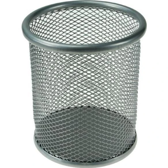 Pojemnik na długopisy - wykonany z metalowej siatki powlekanej srebrnym lakierem - wymiary: wys. 10 cm, 9 cm.