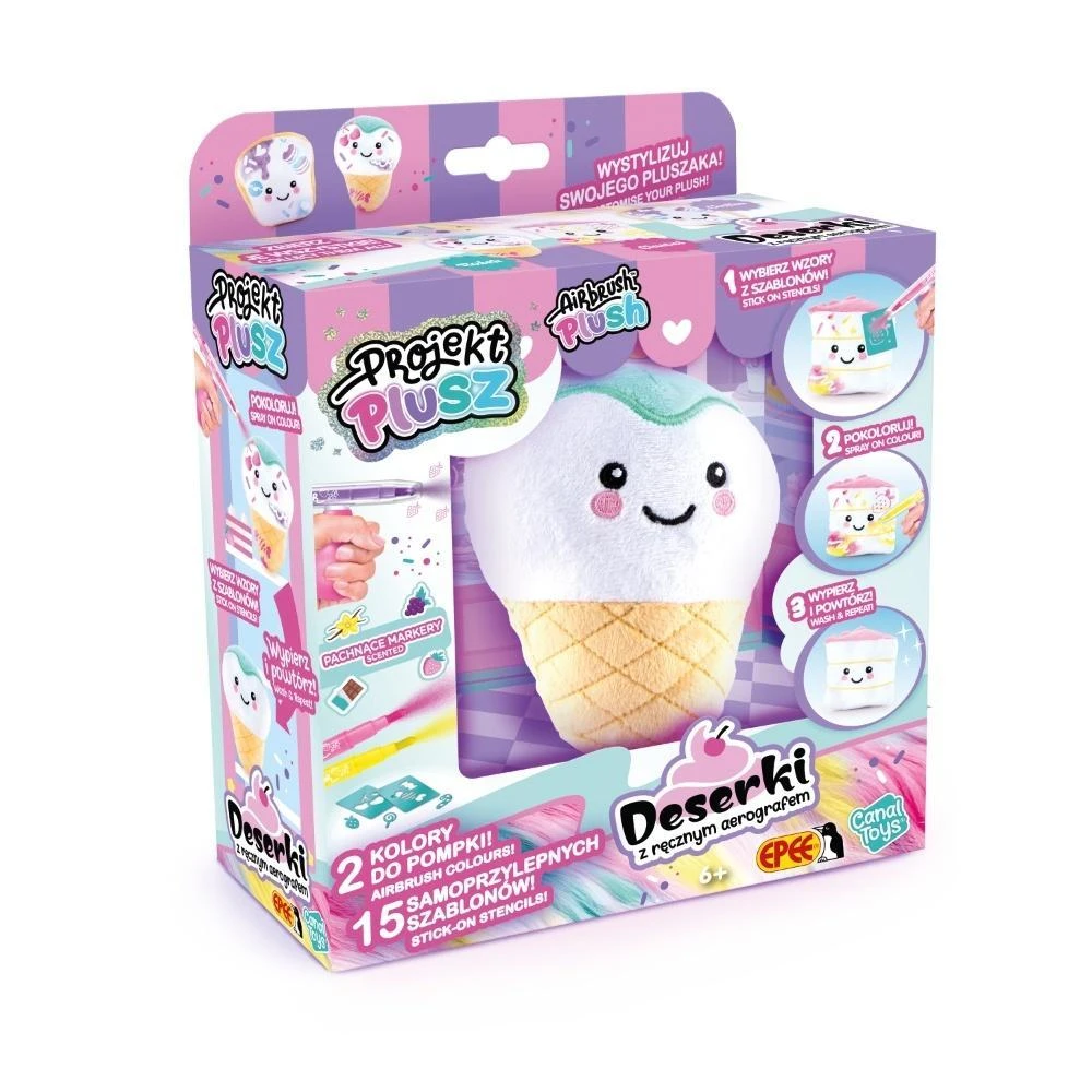 Projekt Plusz to jedyna w swoim rodzaju linia pluszaków, które możesz dekorować bez końca! Dzięki dołączonemu aerografowi nadasz swoim Deserkom unikalny wygląd, a gdy najdzie Cię ochota na zmiany możesz je po prostu wyprać i zacząć całą zabawę od nowa!