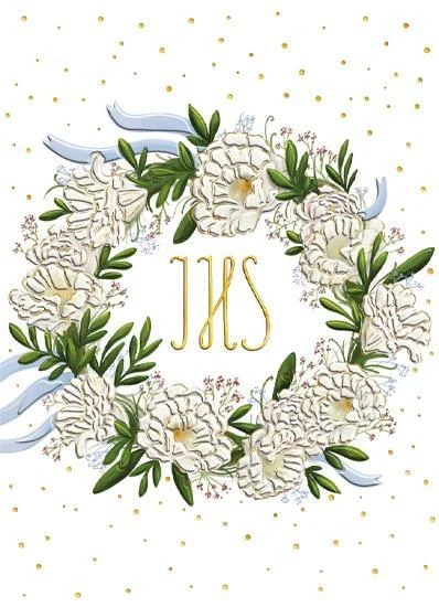 Pudełko Pamiątkowe z okazji Komunii Świętej o wymiarach 170x210x40mm. Otwierany jak okładka książki, zamykany wiązaniem na kokardkę. Zawiera karnet okolicznościowy B6 z życzeniami, całość stanowi komplet graficzny z pudełkiem. Produkt wysokiej jakości uszlachetniony złotem.