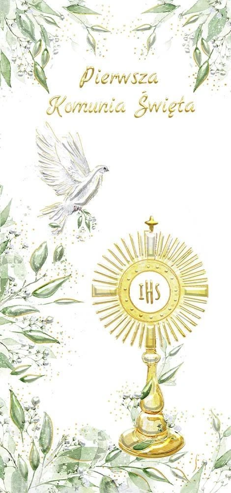 Pudełko Pamiątkowe z okazji Komunii Świętej o wymiarach 245x135x20mm. Zawiera karnet okolicznościowy DL z życzeniami, całość stanowi komplet graficzny z pudełkiem. Produkt wysokiej jakości uszlachetniony złotem.