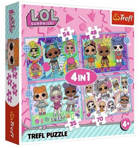 To puzzle dla dzieci składające się z 4 niezależnych układanek, zaprojektowane z myślą o wszystkich fanach i fankach L.O.L. Po ułożeniu puzzli powstaną cztery obrazki o wymiarach 285 x 200 mm każdy. Zróżnicowana liczba elementów (35, 48, 54, 70) pozwala na zabawę zarówno młodszym, jak i nieco starszym fanom puzzli. Zestaw doskonale spełnia oczekiwania rodzeństwa - każdy ułoży swój ulubiony obrazek nawet w tym samym czasie. Zróżnicowana liczba elementów pozwala na zabawę zarówno młodszym, jak i nieco starszym dzieciom. Do produkcji puzzli użyliśmy materiałów ekologicznych i papieru eliminującego odbijanie światła, co gwarantuje bezpieczeństwo i radość zabawy.