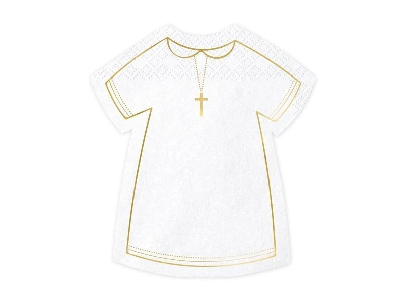 Serwetki papierowe w kształcie alby komunijnej w kolorze białym ze złotym metalizowanym nadrukiem, wymiary po rozłożeniu ok. 28 x 32 cm, wymiary po złożeniu ok. 14 x 16 cm.(1 op. / 20 szt.)