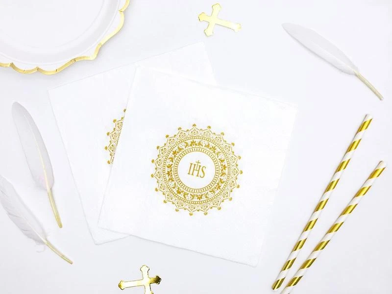 "Serwetki komunijne papierowe białe ze złotym nadrukiem IHS, wymiary po rozłożeniu ok. 33 x 33 cm, wymiary po złożeniu ok. 16,5 x 16,5 cm. (1 op. / 20 szt.)"