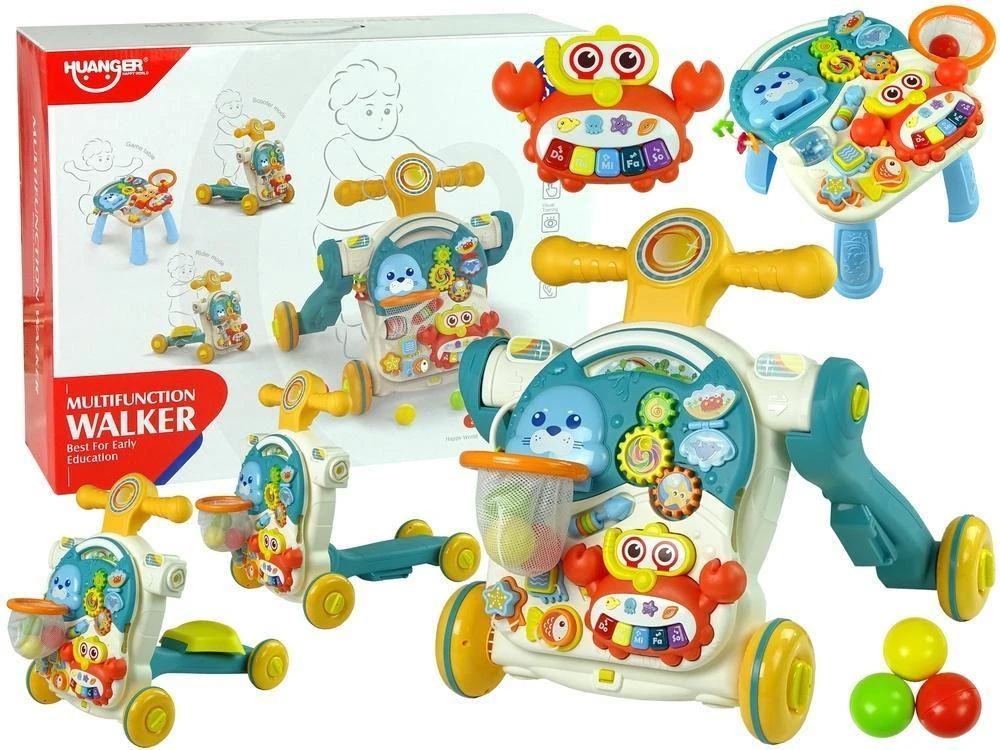 Super zaletą zabawki jest to, że można ją używać na cztery różne sposoby. Maluch decyduje, co wybiera. Może rozpocząć zabawę z samym panelem, tworząc stolik edukacyjny, drugą opcją jest jazda jak na rowerze, trzecią jazda na hulajnodze lub funkcja pchacza, która wspomaga naukę chodzenia.