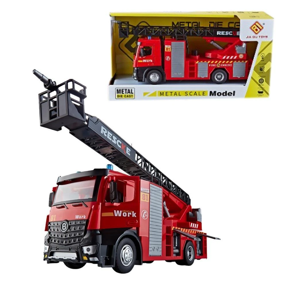 Straż pożarna na baterie. Efekty dźwiękowe oraz światła. Wysuwana drabina, zakończona psikawką z której można pryskać wodą. Otwierane drzwi od kabiny oraz otwierane boczne szare drzwi, pod którymi znajduje się sprzęt strażaka. Wymagane baterie - 3xAG13 (dołączone).