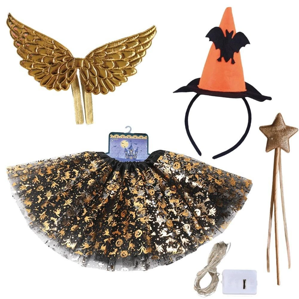Strój czarownicy na Halloween W zestawie tiulowa spódniczka (długość 30 cm), opaska - kapelusik, różdżka, skrzydełka, ledowe światełka. Wymiary: 49,5x2x52cm