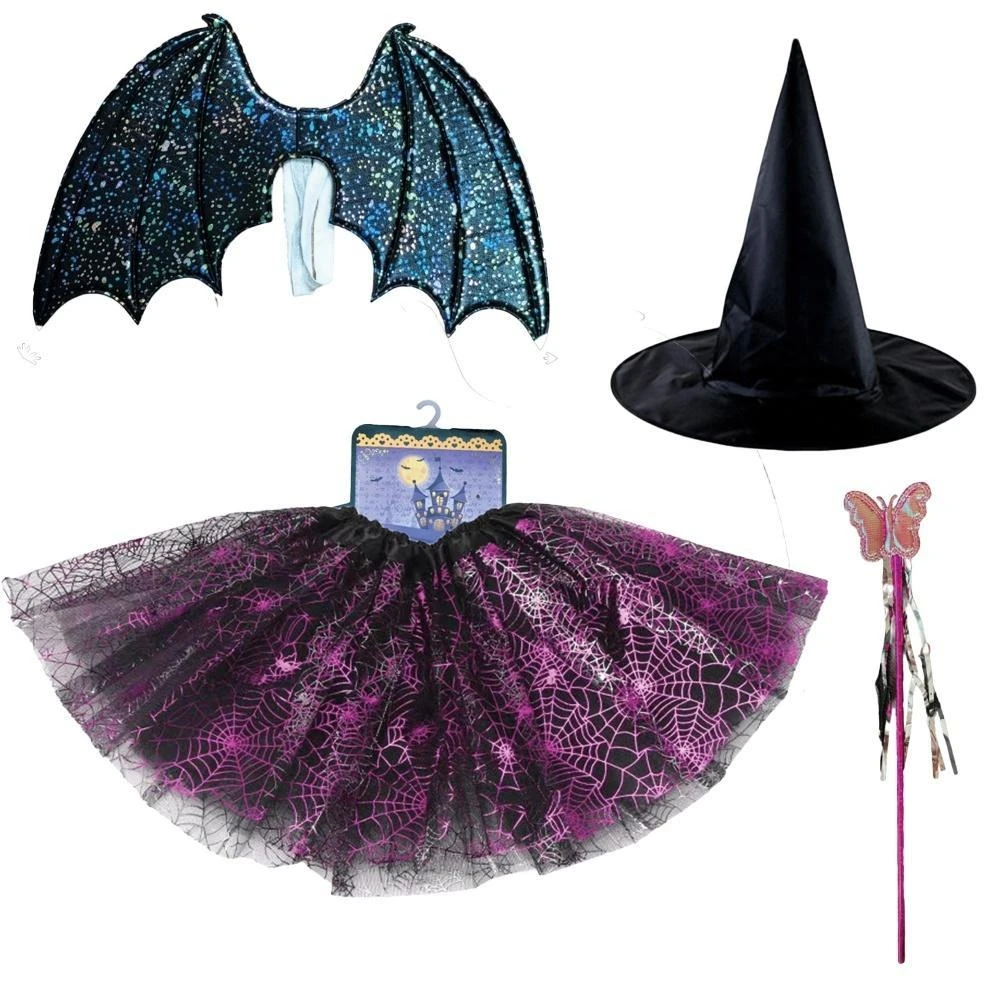 Strój czarownicy na Halloween W zestawie tiulowa spódniczka (długość 30 cm), opaska - kapelusik, różdżka, skrzydełka, ledowe światełka. Wymiary: 49,5x2x52cm