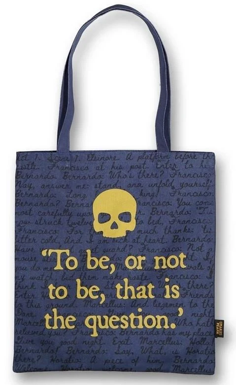 Na granatowym tle torby widnieje złoty napis "To be, or not to be, that is the question."oraz prosty symbol czaszki - klasyczne odniesienie do jednej z najbardziej znanych...