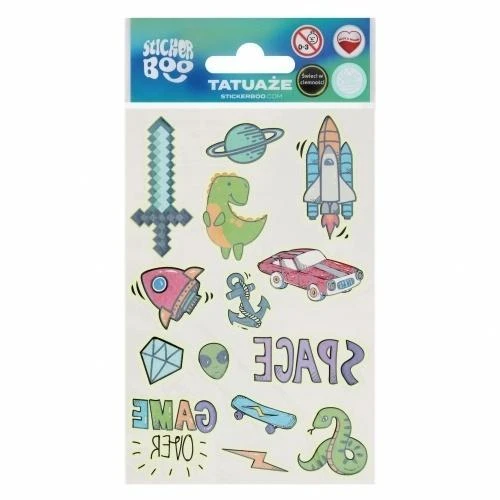 Tatuaże świecące w ciemności STICKER BOO z pewnością przypadną do gustu dzieciakom, idealne do zdobienia ciała, dadzą dużo frajdy oraz satysfakcji i wiele możliwości. Łatwe w użyciu! Aby usunąć tatuaż wystarczy tylko użyć oliwki lub mydła. Zawartość zestawu: 1 arkusz z 14 tatuażami mix wzorów.