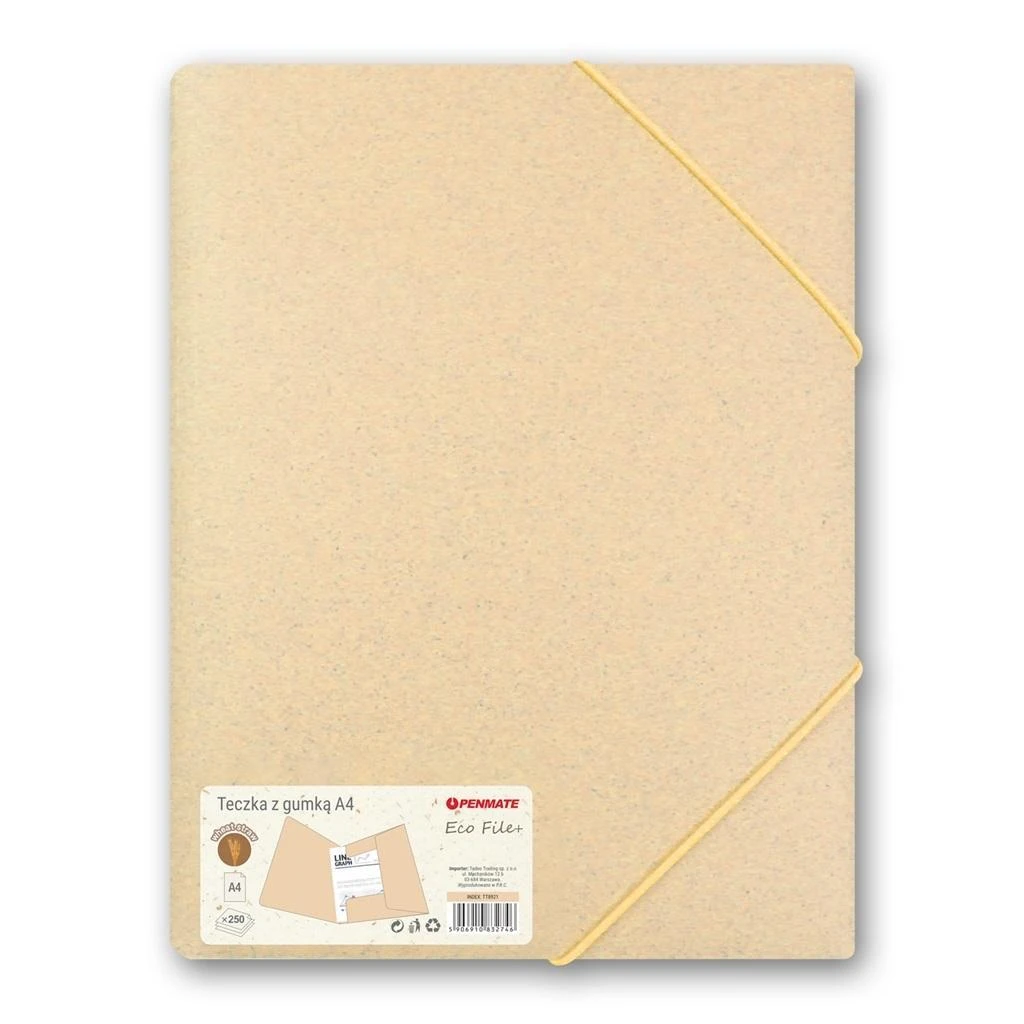 pszenicznej. Kreatywny, nowy materiał ma właściwości i zalety podobne do tradycyjnych tworzyw sztucznych. Grubość 0,35 mm. Teczka zamykana na gumkę w kolorze teczki. Wymiary: 240x320 mm. Pakowana pojedynczo w woreczek foliowy.