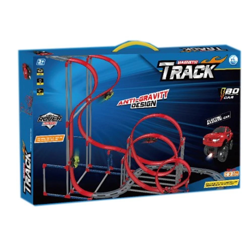 Nasz tor magnetyczny to prawdziwa gratka dla małych miłośników motoryzacji i techniki. Zestaw składa się z 164 elementów, które pozwalają na stworzenie niesamowitego toru, na którym autka jeżdżą do góry nogami, nie spadając. W zestawie znajdują się autko, które świeci podczas jazdy, dodając jeszcze więcej frajdy. Wymiary rozłożonego toru: 130 x 56 x 94,5 cm Wymiary opakowania: 67 x 7 x 43 cm Ilość elementów: 164 Zasilanie: 2 x AAA (niedołączone) Wiek: 3+ lat