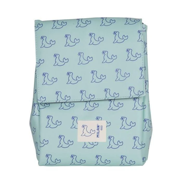 Torba izotermiczna w kolorze zielonym z granatowym wzorem foki. Kolekcja 460 inspirowana oryginalnymi kolorami i wzornictwem gumek MILAN, produkowanych w Hiszpanii od 1918 roku. Zamknięcie na rzep. Regulowany uchwyt do przenoszenia w błyszczącym niebieskim kolorze z zapięciem na klamrę. Izolowane termicznie wnętrze (zimno/gorąco) dla lepszego przechowywania żywności. Zawiera 2 hermetyczne okrągłe pudełka z zakręcaną pokrywką o pojemności 0,25 l. Skład materiału: 100% poliuretanowa tkanina zewnętrzna i izotermiczna wyściółka wewnętrzna (P.E.V.A.). Wymiary: 20 x 14 x 27 cm. Pojemność: 3,5 l
